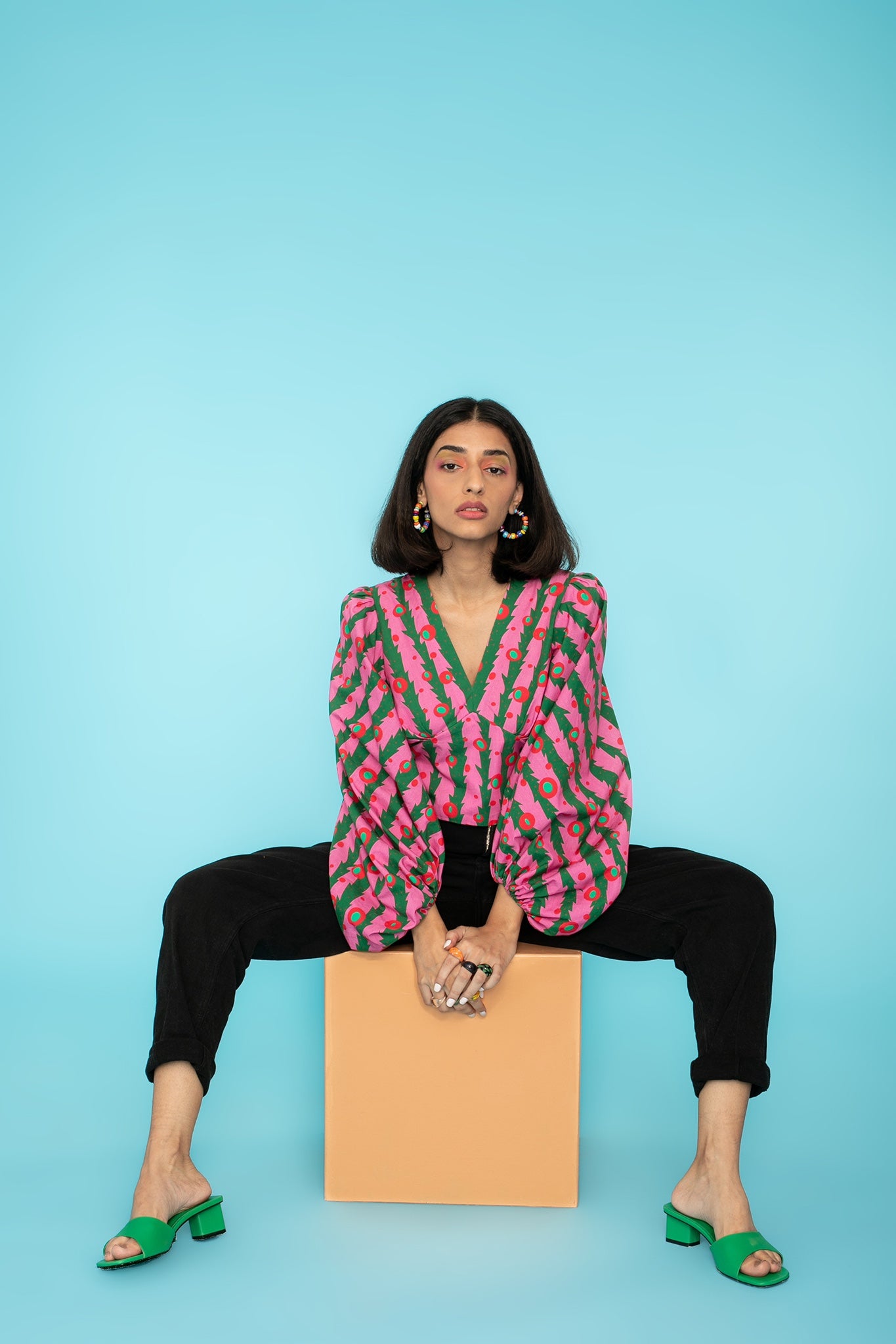 The Daphne top has a V-neckline framed with statement puffed sleeves. The cut at the empire along with the gathers ensure a perfect fit.